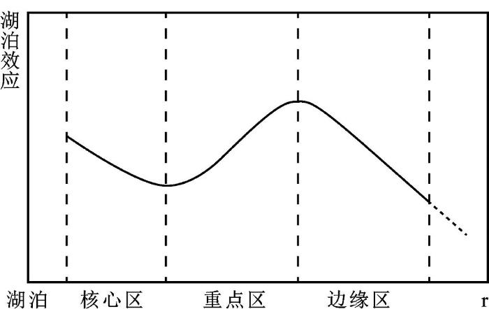 在BASS模型结论的基础上,假定环湖区域无其他地理要素影响且处于理想状态[15](湖泊水质均匀、周边陆地土地均质、城市发展基础与机遇相同等),本文做出如下推定:① 依据湖泊对不同距离城市经济的影响程度可将经济影响区划分为3层:核心区、重点区和边缘区;② 随着距离的增加,湖泊对环湖城市经济的影响力呈现先下降后上升继而持续下降的趋势(图1)。