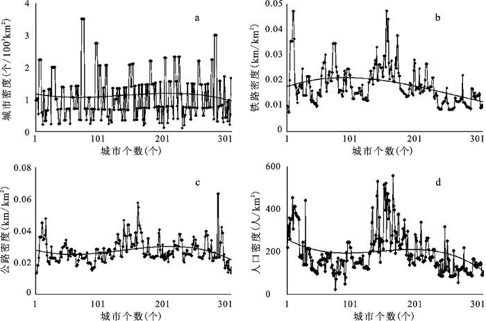 利用缓冲分析得到的统计数据,在每增加一个缓冲带时,用城市个数(铁路长度、公路长度、人口数)增量除以缓冲带面积增量,得到相应的3阶城市密度、铁路密度、公路密度和人口密度方程。从图2(a~d)可以看出,城市密度趋势线、公路密度趋势线和人口密度趋势线基本符合BASS模型推定的湖泊对与城市经济影响的变化趋势。