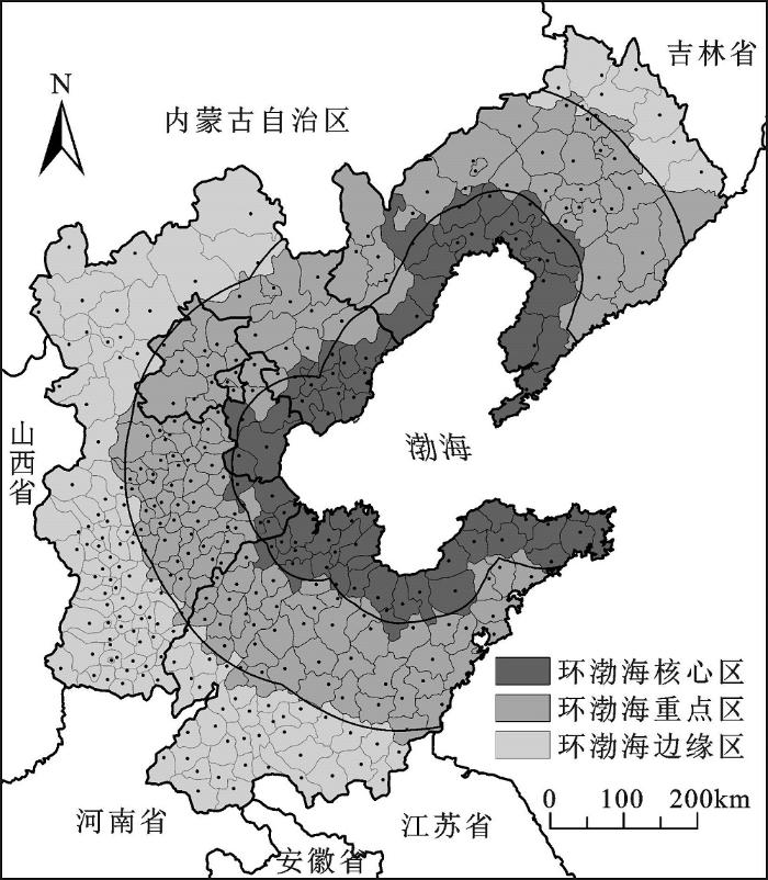 以环渤海地区3省2市为例,将渤海看作一个巨大的湖泊,以“湖泊效应”表征渤海对环渤海地区的经济影响,通过BASS模型构建理论体系,借助GIS空间分析技术进行缓冲分析,并利用非线性回归分析在不同缓冲半径的基础上确定各分区的边界,从而对渤海辐射影响下的城市经济影响区范围进行界定,并对各经济影响区的特征进行描述。