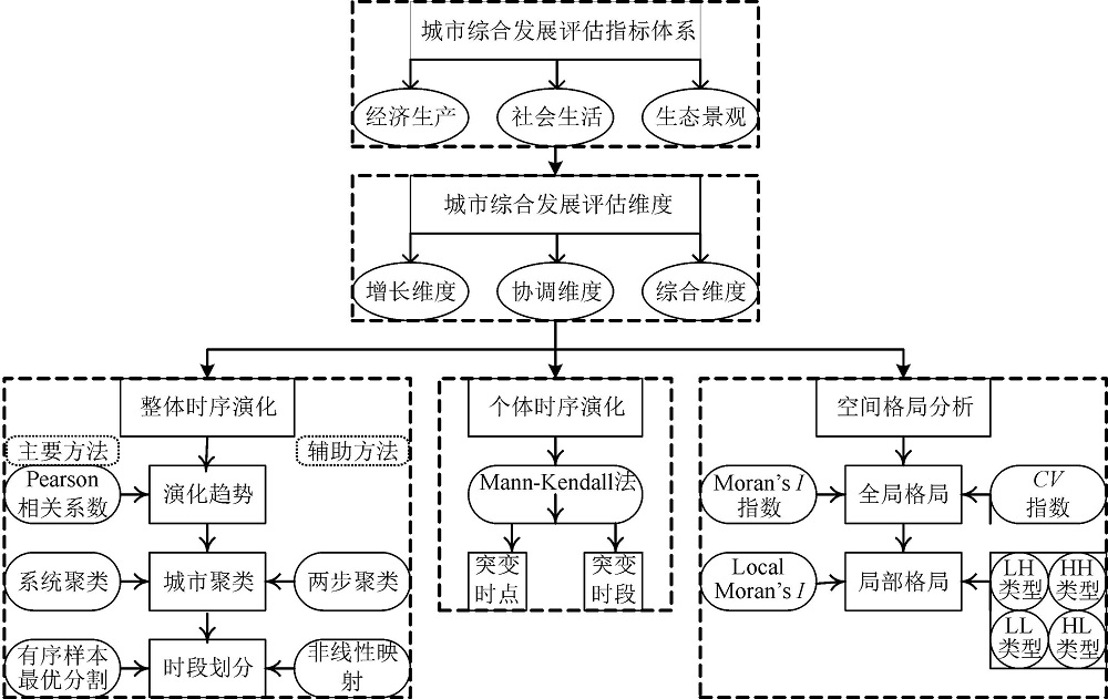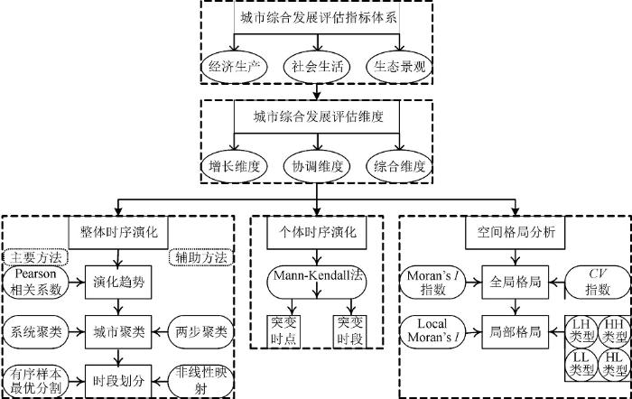首先以城市经济-社会-生态3个子系统构建城市综合发展水平评估指标体系;其次将城市综合发展水平依次定性分为增长、协调与综合3个维度;然后以演化趋势(Pearson相关系数)、城市聚类(系统聚类辅以两步聚类)、时段划分(有序样本最优分割辅以非线性映射)依次进行城市综合发展水平的时序演化分析;再以Mann-Kendall法进行时序突变分析;最后分别从全局尺度(Moran’s I为主、CV为辅)和局部尺度(Local Moran’s I)探讨空间格局及其演化过程。如图2所示。