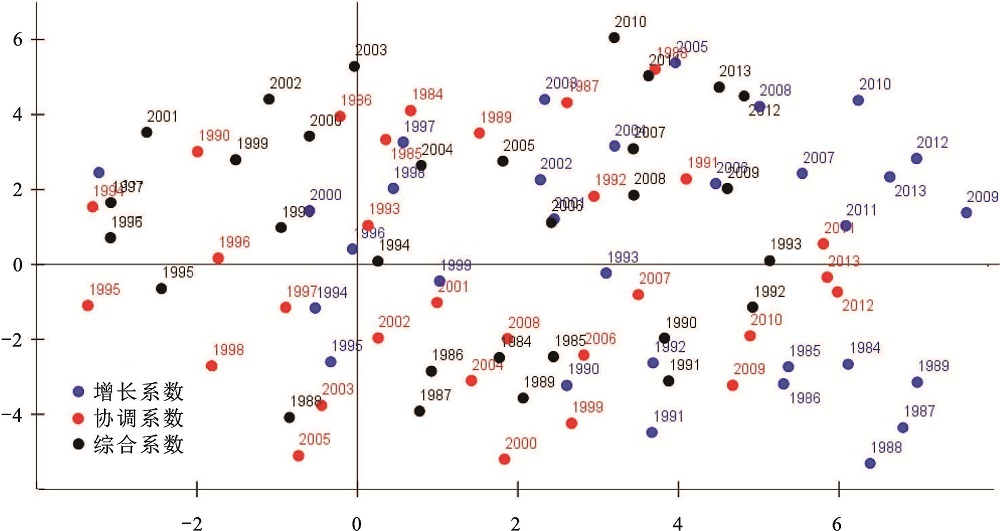 图3 1984~2013年湖北省16城市增长、协调、综合系数的非线性映射分析