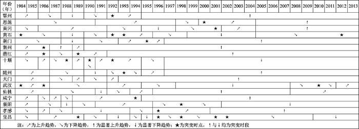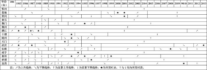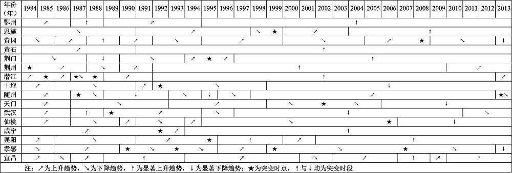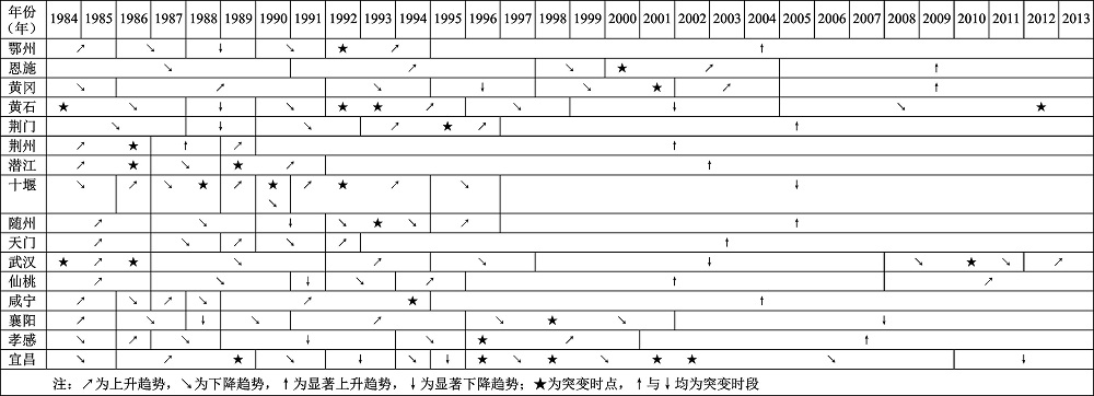 综上所述,1984~2013年影响湖北城市综合发展的关键时点依次为1992年/1993年与1997年/1998年及2005年/2006年/2007年,充分、精确的表征了改革转轨时期制度创新、发展观变化和体制机制改革对城市经济-社会-生态系统综合发展状况的决定性影响[30]。