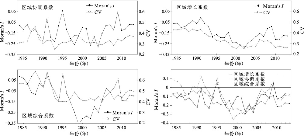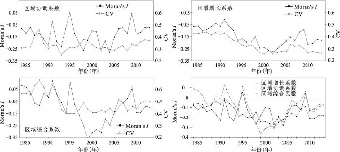 图7 1984~2013年湖北16城市增长、协调、综合系数的Moran’s I与CV的演化状况