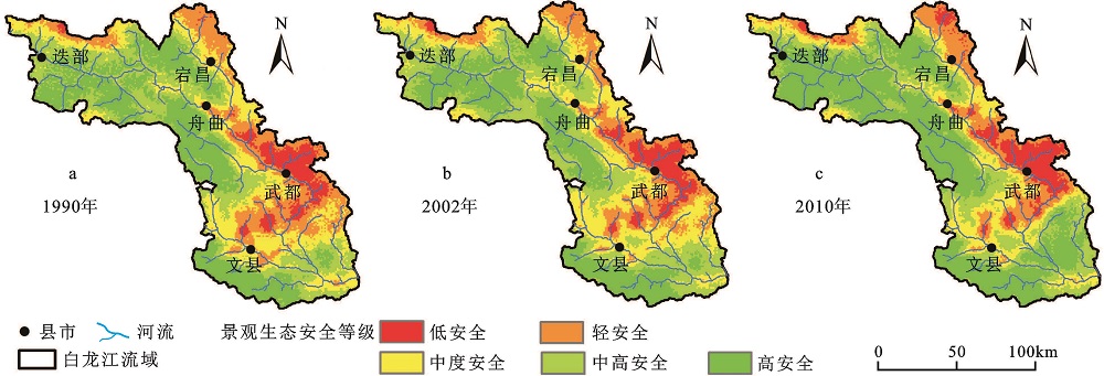 Fig.2 Landscape security state distribution in the Bailongjiang River watershed from 1990 to 2010