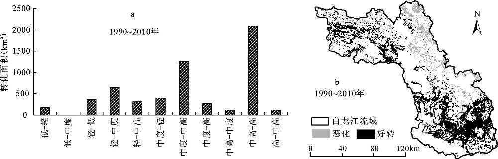 图5 1990~2010年白龙江流域景观生态安全面积转换及空间分布