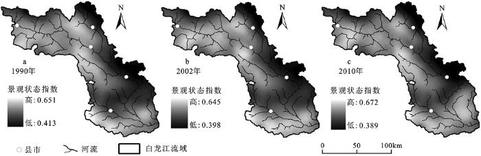 1990~2002年间,白龙江流域景观状态总体变化不大,但最大值和最小值下降趋势明显,分别从0.651和0.413降至0.645和0.398,表明流域内景观结构不稳、破碎化加剧、脆弱性增加、形状不规则,景观生态服务价值功能呈现减少趋势(图2)。2002~2010年间,景观状态指数最小值持续减少,最大值呈增长的趋势,表明景观状态呈现两极分化突出,与景观生态压力刚好相反,即高生态压力区域其景观状态质量较低。在空间分布上,流域景观状态格局变化较小,景观状态较好区域占主导优势,主要集中在森林、草地等景观类型区,尤其是国家森林自然保护区,如甘肃文县尖山大熊猫自然保护区、白水江国家级自然保护区、舟曲县插岗梁自然保护区、迭部县阿夏与多儿大熊猫自然保护区、武都裕河森林自然保护区、迭山林业发展区等。而景观状态质量较低的地区主要分布在武都区的安化镇、马街乡、汉王镇、鱼龙乡、三河镇、熊池乡及两水镇,宕昌县的哈达铺镇至八力乡以及县城至车拉乡等区域。