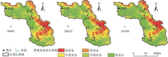 1990~2010年期间甘肃白龙江流域景观生态安全总体呈现增长的趋势,其空间分布格局变化不大,但呈一定的规律性,即景观生态安全的空间分布与滑坡、泥石流和水土流失等地貌灾害发生的空间格局相反,但在土地利用类型上的分布格局相似。具体而言,其生态低安全区(灾害高风险区)以舟曲-武都段白龙江两岸及其以北区域最为严重,生态高安全区(灾害低风险区)则主要分布在自然保护区和林业发展区。