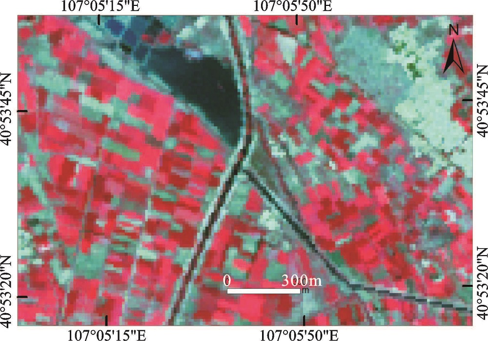 试验区域选择内蒙古杭锦后旗中部592×391像元大小的影像,试验区土地利用以农用地为主,土地覆盖类型包括耕地、盐渍化土地、水域、城镇居民用地和交通用地,成像时间为2010年8月,投影坐标系统均为WGS_1984_UTM_ZONE_48N,数据包括ALOS PRISM全色影像和AVNIR-2多光谱影像(B1:0.42~0.50 μm;B2:0.52~0.60 μm;B3:0.61~0.69 μm;B4:0.76~0.89 μm),参与融合的多光谱影像为R(4)G(3)B(2)假彩色合成,合成影像中植被呈红色,水体呈黑色或蓝色,居民用地呈亮白色(图1)。