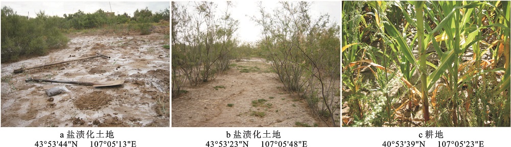 杭锦后旗地处河套平原,地理位置为东经106°34′~107°24′E,北纬40°26′~41°13′N之间,总面积约1 767 km2。属中温带大陆性气候,冬季漫长而寒冷,夏季短促而温热,风多雨少,蒸发强烈,年均降水量135.9 mm,年均蒸发量1 984.3 mm。旗内地貌由冲击平原、洪积平原和河漫滩构成,地势西南高,东北低,由西南向东北微度倾斜。杭锦后旗土地盐渍化严重[14~16],盐渍化土地以耐盐杂草、灌木覆盖为主。