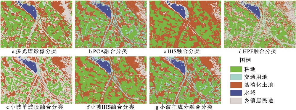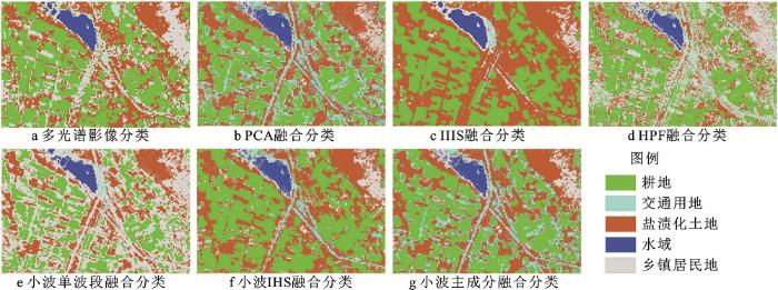 从表3可知,PCA、小波PCA和小波IHS融合影像的总分类精度和Kappa 系数高于多光谱影像,其中PCA融合影像的总分类精度最高;而IHS 、HPF 和小波单波段融合影像的总分类精度和kappa 系数均低于多光谱影像;HPF融合影像分类精度和Kappa系数最低,这与吴瑞娟[17]等对HPF融合的研究结果一致。PCA融合影像的盐渍化土地和耕地的分类精度略高于多光谱影像,小波IHS和小波PCA融合影像的盐渍化土地和耕地的分类精度与多光谱影像接近,IHS 、HPF 和小波单波段融合影像的盐渍化土地分类精度远远低于多光谱影像,但目视观察可知小波变换法损失了不少地物边界信息。由于PCA融合影像空间细节表达能力和光谱信息保真程度优于其他融合影像,地物总分类精度和Kappa 系数最高,盐渍化土地的分类精度也略高于其他融合影像,因此PCA融合法为试验区土地盐渍化信息分析最优的一种融合方法。