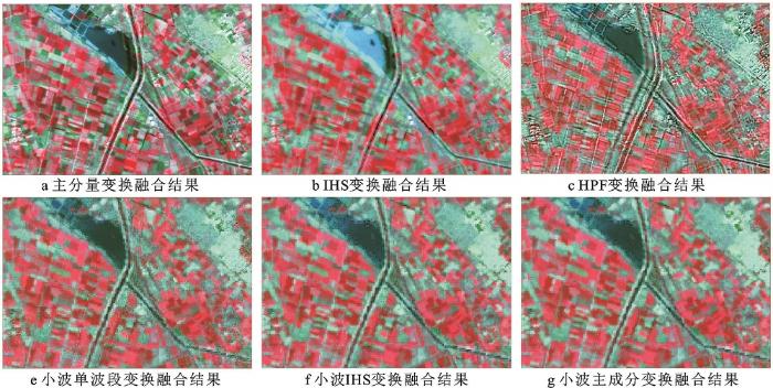 1) 影像融合。影像融合在ERDAS9.2软件平台下进行,将依地面控制点配准后的多光谱影像和全色波段影像分别进行PCA、HPF、HIS、WAVELET(单波段法、IHS法和PCA法)融合(图2)。