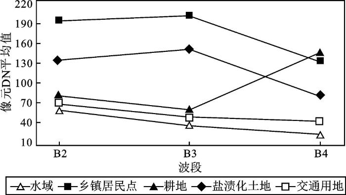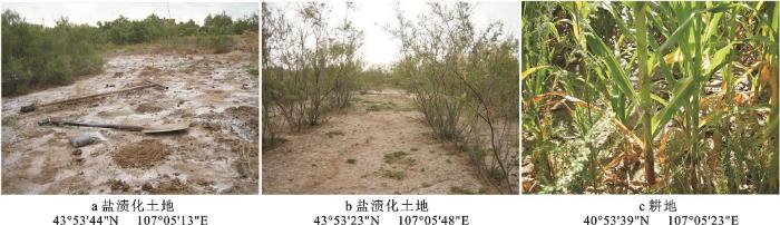 | 盐渍化土地 | 疏松盐壳,覆盖结晶盐层,寸草不生或长有少量红柳等盐生植物,呈斑状分布 | 青灰色-青白色,几何特征不明显,边界清晰 |