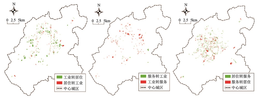 式中,IRCC指“工业用地和居住用地”转变耦合系数,CIR和CRI分别指研究期间工业转变为居住用地和居住转变为工业用地的面积,CI和CR分别指两期土地利用数据叠加分析处理后性质发生变化的工业和居住地块面积。