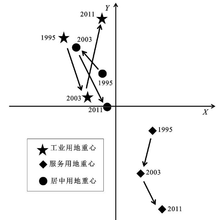空间重心是描述地理现象空间分布的重要指标,常被用于城市空间和土地利用类型演变的研究[22]。2011年长春居住用地重心位于工业用地重心南偏东约10o、1.80 km处,服务用地重心位于工业用地重心南偏东约17o、4.60 km处,说明工业空间与居住、服务空间整体分异明显,并且与服务空间分离程度明显高于居住空间,这主要是受南部高校相对密集和东南部净月区服务空间比重较高的影响。通过1995年、2003年与2011年用地重心位移(图1)分析发现,工业空间与居住、服务空间分异整体呈现加大趋势。设X轴为解放大路,Y轴为人民大街,建立X、Y轴坐标系为各重心的相对位置提供参考。