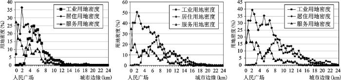 环系统分析结果显示,2011年距人民广场11.0 km以内居住用地密度明显大于工业和商业用地,13.5 km以外工业用地密度明显大于居住和服务用地,服务用地密度普遍较小,除4.0 km以内明显大于工业用地、4.0~6.5 km之间与工业用地相差不大外,其他圈层均明显小于工业和居住用地,居住与服务用地密度分别距人民广场约20.0 km和17.0 km处趋于零,工业空间则延伸至约24.0 km。说明当前城市核心区居住与服务空间占主导,但服务用地比重较低,外围工业空间占主导,居住、服务空间配套不足。