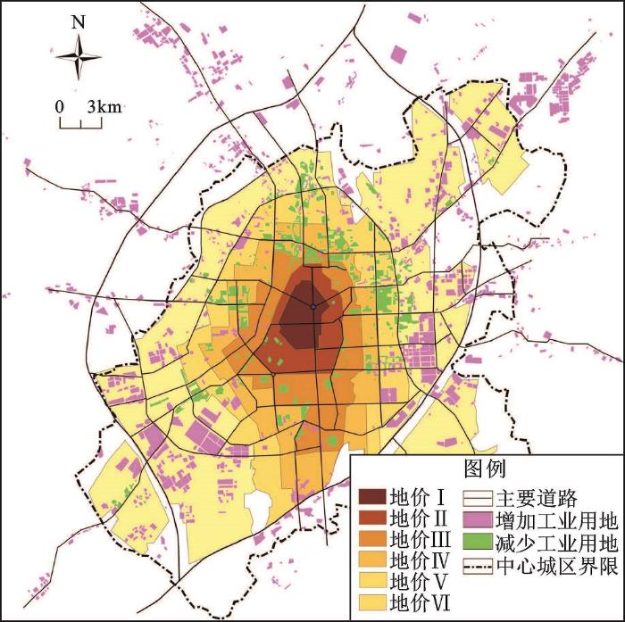 1990年代以来土地有偿使用制度的确立使得地价成为配置土地资源和调节不同类型经济活动的重要机制,城市空间开始遵循“地租-空间竞争”理论进行重构,工业空间不断从核心区迁出,对工业空间郊区化和城市功能空间优化起到了积极的推动作用。将长春市国土资源局提供的《工业用地级别基准地价图》[24]分别与1995~2011年间增加和减少的工业用地叠加(图4)分析得出:新增工业空间主要分布于基准地价较低的Ⅵ级及以外地价区,地价相对较高的Ⅲ、Ⅳ、Ⅴ级区新增工业空间较少,但随地价的降低呈现增多趋势,内部较高的Ⅰ、Ⅱ级地价区未出现新增工业用地,而减少的工业用地主要分布于Ⅴ级以内(75.93%)。