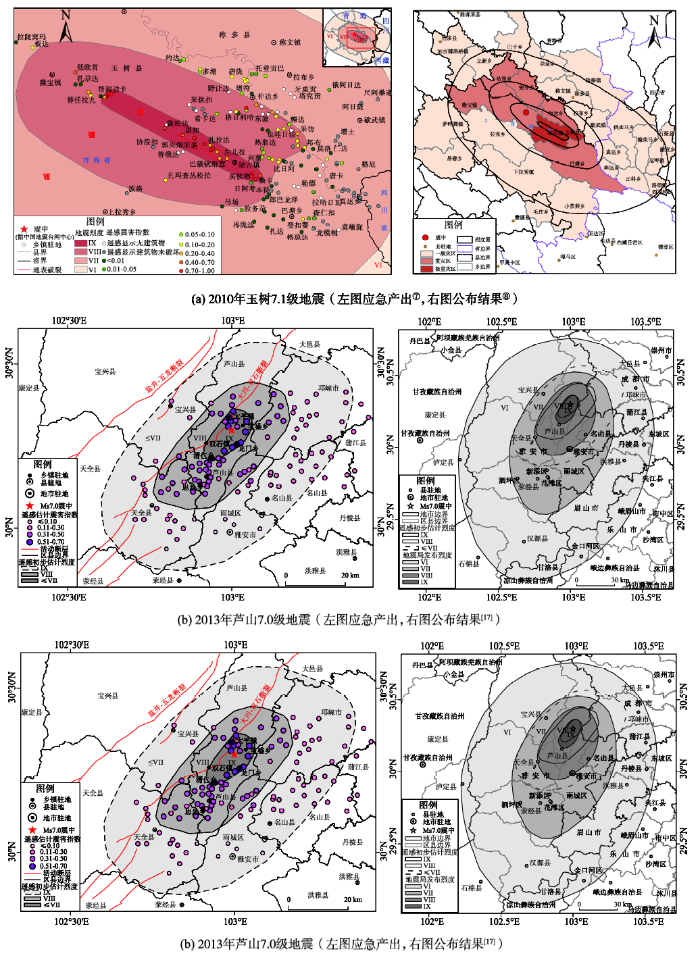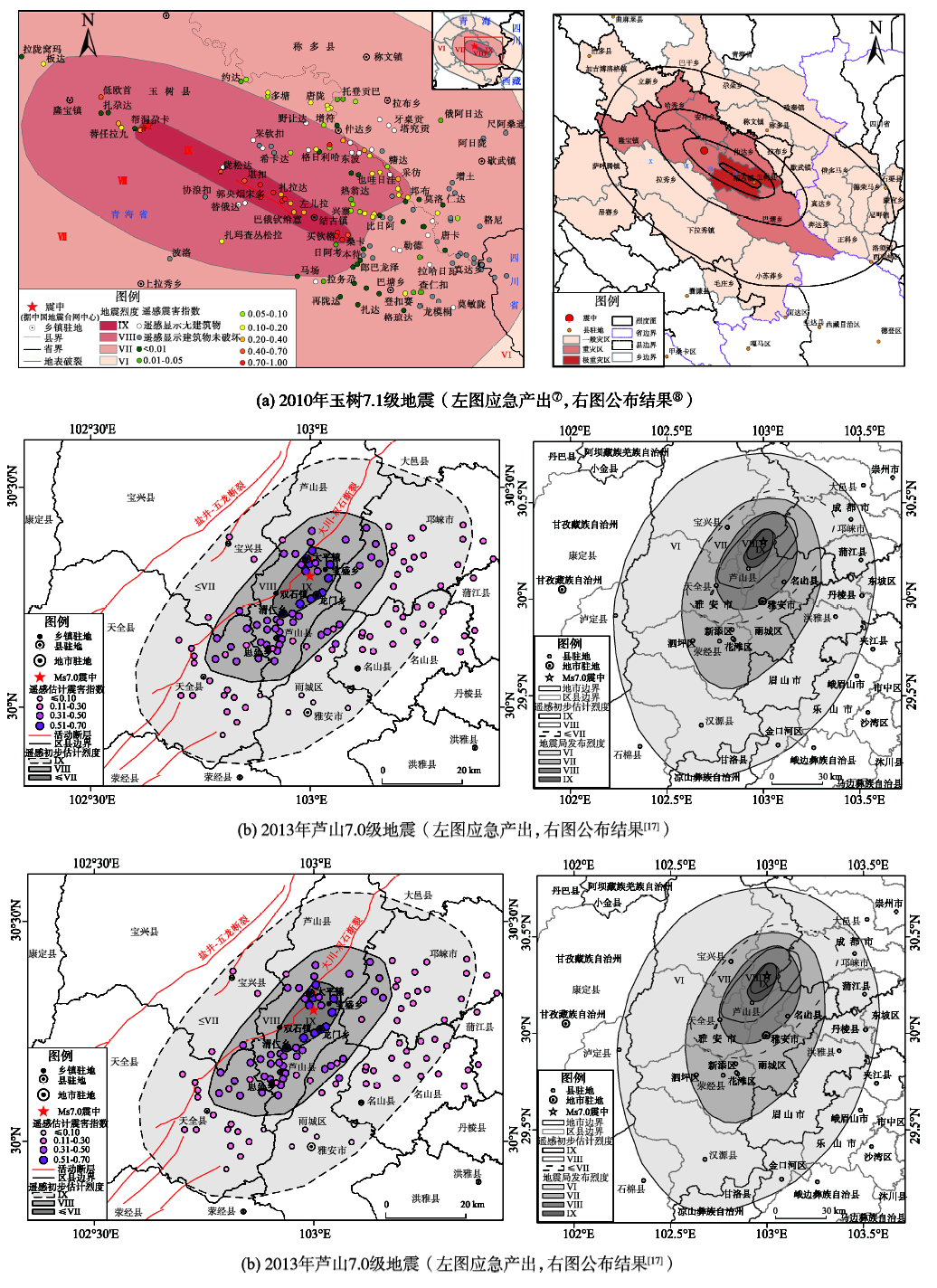 图4 典型震例地震烈度应急遥感评估结果图(左列)与公布结果(右列)对比图(⑦中国地震局地震预测研究所,2010. 2010年青海玉树7.1级地震震害遥感影像解译图集(内部)⑧ 国务院关于印发玉树地震灾后恢复重建总体规划的通知. http://www.gov.cn/zhengce/content/2010-06/13/ content_5598.htm. 2010.6.13)