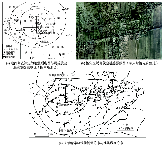 “八五”期间,中国组织了“重大自然灾害遥感监测与评估”研究,陈鑫连,魏成阶等开展了航空遥感的地震灾害损失快速调查评估与减灾辅助决策研究,进行了震害分级分类,初步建立了震害分级分类遥感判读标志,并建立了依据各类震害及其程度的组合,结合GIS技术综合评判地震烈度的方法,对唐山震例进行了研究验证[10]。2003年2月24日新疆巴楚-伽师6.8级地震后,采用这一思想,在地震应急阶段进行了快速震害遥感解译,得到了高烈度区(VIII度及以上地区)的地震烈度遥感评估结果(图1)[11]。这一成果标志着遥感在地震应急中的应用进入了一个新的时代。