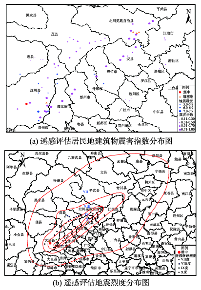 图2 2008年5月12日汶川8.0级地震建筑物震害与地震烈度应急遥感评估图