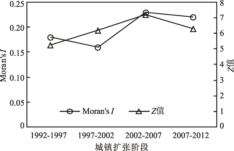 3.1.2 城市群空间集聚扩展呈现出“先增强、后减弱”的态势 Moran’s I指数的计算结果显示(图4,图5),1992-2002年、2002-2012年Moran’s I指数分别为0.17、0.23,Z值得分分别为5.72、6.73,说明京津冀城市群空间扩展呈现出持续“集聚”态势,与珠江三角洲和长江三角洲城市群的时空扩展路径截然不同。相关研究成果表明[2, 4],改革开放初期,由于中心城市对外来人口准入限制、外资企业的低廉成本诉求、乡村工业崛起等经济制度背景,珠江三角洲和长江三角洲城市群空间扩展率先发生在中心城市的外围地区,比如东莞、中山、苏州、常州等核心城市的外围地区城市空间扩展剧烈,城市群表现出明显的“分散”扩展态势。京津冀城市群空间扩展率先发生在北京、天津、唐山等核心城市,可以归纳为集聚导向下的城市群空间扩展模式。分别计算1992-1997年、1997-2002年、2002-2007年、2007-2012年4个时段的Moran’s I指数及其Z值得分变化趋势(图6),结果显示,1992-2007年,Moran’s I指数由0.18增长到0.23,Z值得分由5.27增长到7.21,表明城市群空间扩展呈现出加速集聚的状态,而2007-2012年,Moran’s I指数和Z值均出现了下降,表明城市群空间扩展的集聚态势出现了减弱态势。