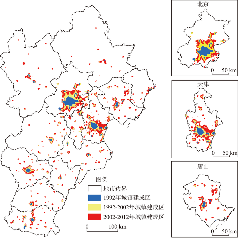 图8 1992年、2002年、2012年京津冀城市群空间扩展格局