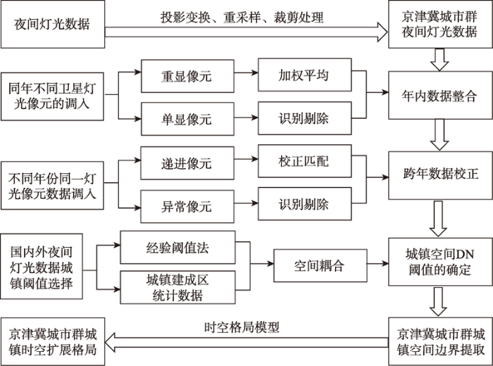 通过国内外研究综述可以看出,以中国为代表的发展中国城市群在快速城镇化阶段初期,城市群空间演进的路径与西方发达国家城市群空间演进的路径并不相同,制度环境的差异是造成这一现象的根本原因,因此,中国城市群发展不能停留在单纯借鉴国外城市群研究成果层面,而应该探索符合中国国情和城市群现实条件的城市群演进路径的规律性特征。尤其是随着中国市场经济向计划经济转型进入深水期,全球化、城镇化、地方分权化等多维复杂要素交织,基于长时段城市群空间演进的实证案例研究对于深刻理解城市群演化特征和发展规律具有重要意义。然而,由于高效空间信息获取和处理的限制,造成大尺度、长时段城市群空间的实证研究式中难以完全开展。传统空间统计数据缺乏足够的空间信息,高分辨率遥感影像数据成本高、处理难度大,均难以适应大尺度、长时段城市群空间研究[20]。美国国防气象卫星提供的夜间灯光数据(nighttime light data)具有数据可获得性强、处理量小、亮度指标能反映空间经济活动强度等优点,非常适合开展大尺度、长时段的城市群空间扩展研究,但同时在数据兼容性和稳定性方面也存在一些问题。在以往灯光数据使用的研究基础上[21-22],本文构建了1套运用夜间灯光数据分析城市群长时段空间扩展的技术流程,以突破研究城市群空间研究的数据限制。