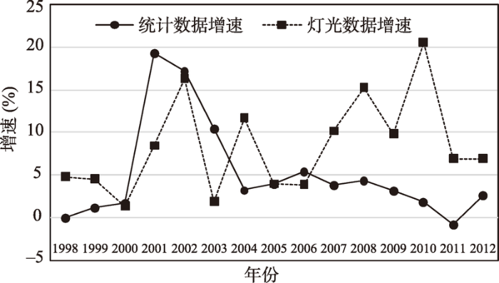 图2 京津冀城市群基于夜间灯光数据的城镇扩展增速与基于统计数据的城镇扩展增速对比