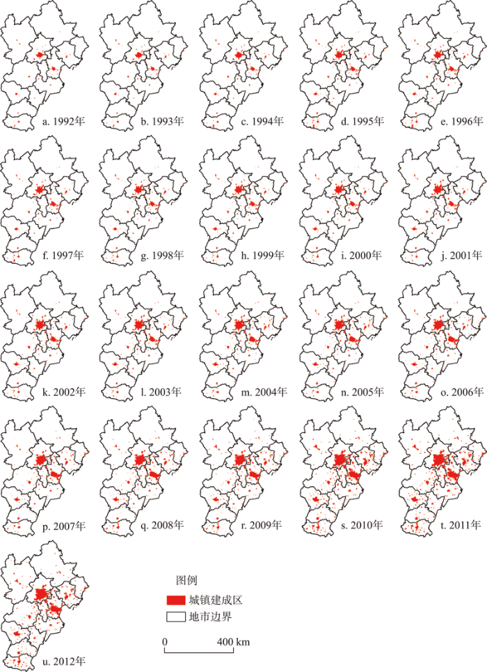 考虑到京津冀城市群在中国国土空间格局中的特殊作用和地位[23],本文选择京津冀城市群为案例,空间范围包括北京、天津2个直辖市以及河北省石家庄市、唐山市、保定市、廊坊市等11个地级市,总面积达21.6万km2。以往京津冀城市群研究着重关注中心城市北京[24-25],城市群层面的研究集中在利用统计数据研究城市群空间扩展格局[26-27]和利用遥感数据进行城市空间扩展模拟等方面[28-29],缺乏长时段城市群时空格局及其动力机制的研究。本研究以夜间灯光数据为切入点,系统分析1992-2012年京津冀城市群时空格局演进及其动力机制,探索京津冀城市群空间扩展路径及其趋势,对于深入理解计划经济向市场经济深度转型期中国城市群空间演化规律和指导京津冀城市群协同发展具有重要意义。