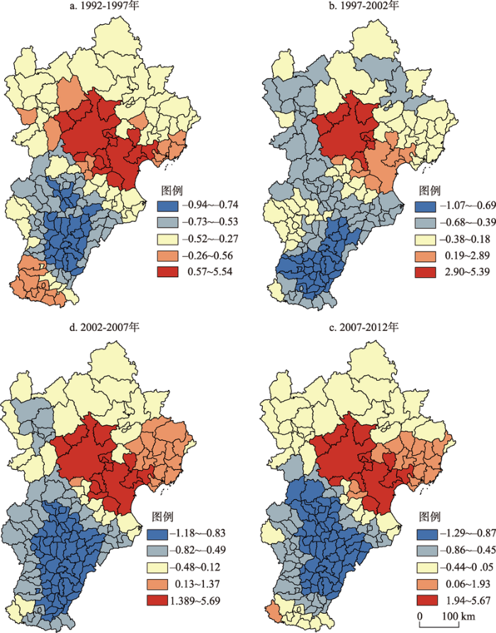 利用夜间灯光数据提取的京津冀城市群城镇空间信息数据,以县级行政单位为基础空间评价单元,在Arcgis10.2空间分析平台,分别计算1992-1997年、1997-2002年、2002-2007年、2007-2012年的Getis-Ord