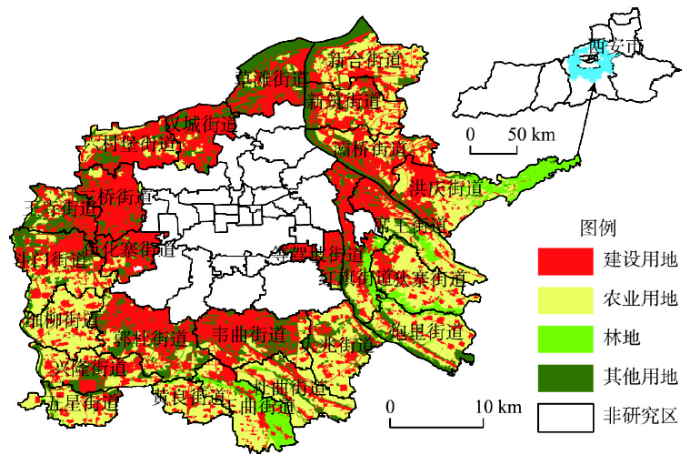 研究数据主要由遥感影像数据和社会经济统计数据两部分组成。遥感影像来源于中分辨率的Landsat 8卫星影像(数据获取时间为2013年9月),同时以Google Earth提供的高清晰影像作为参考;统计数据分别来源于2014年《西安市统计年鉴》以及各街道所属的市辖区统计年鉴,还包括西安市第六次人口普查数据和相关街道提供的统计资料。