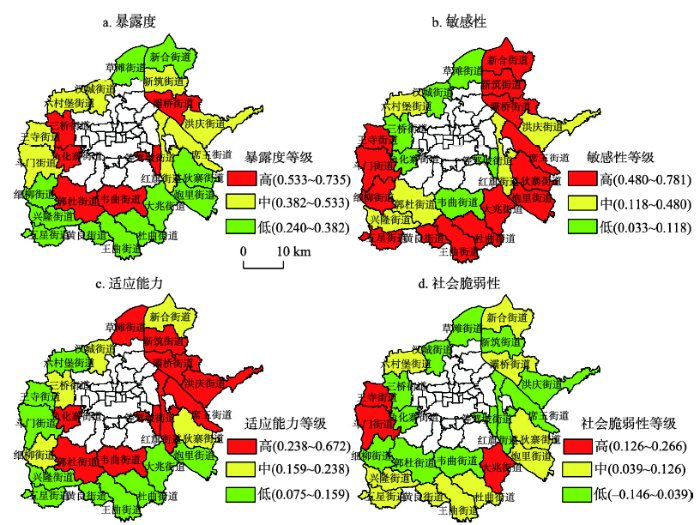 Fig. 3 Spatial distribution of exposure, sensitivity, adaptive capacity and social vulnerability for Xi'an urban fringe