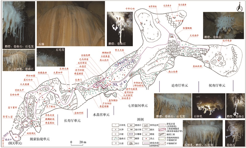 在今后可预测的时间内,各成景要素不可能发生改变,水晶宫将继续以众多晶莹剔透、分布面积较大的卷曲石、石毛、石花和鹅管等体量微型/小型沉积物的继承性发育为主。
