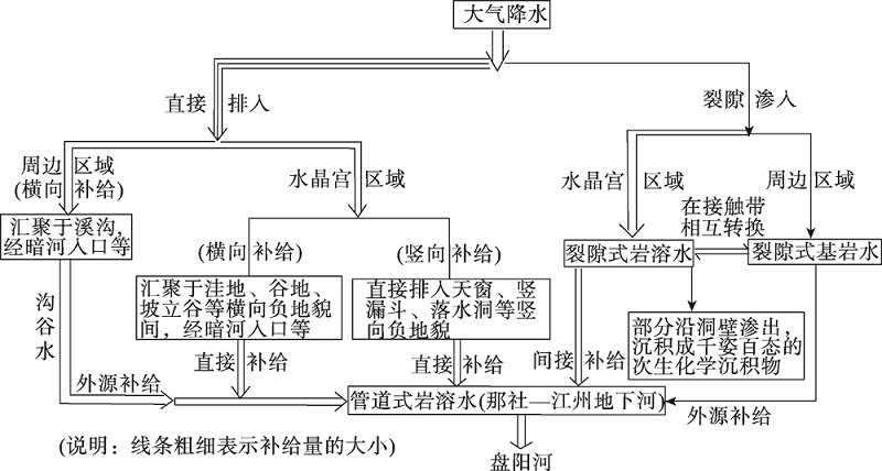 Fig. 4 The sketch map of interconversion between karst water and surface water in the area of Shuijing Cave in Bama, Guangxi