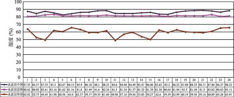 Fig. 7 The humidity variation of Shuijing Cave in Bama, Guangxi from January, 2009 to December, 2010 (1-12 represent the humidity variation from January to December of 2009; 13-24 represent the humidity variation from January to December of 2010)