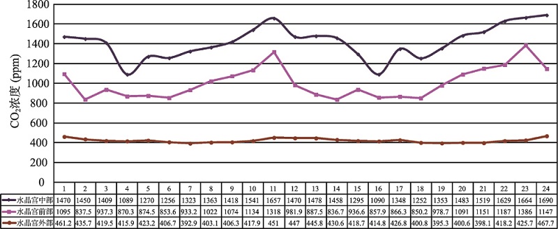 现代,水晶宫具备与“区域构造平稳后期—洞穴次生化学沉积物缓慢或停止发育阶段”高度相似的发育条件,总体处于区域构造平稳后期—洞穴次生化学沉积物缓慢发育/停止发育阶段:裂隙水正从洞顶或洞壁渗出,以滴水、壁流水、毛细水为主,水量常年较小,季节性变化不明显,洞内恒温、恒湿,CO2浓度较高(图6,图7,图8),正在形成众多晶莹剔透、分布面积较大的卷曲石、石毛、石花和鹅管等体量微型/小型的沉积物(主要分布于洞穴后部);而前期形成的类型丰富、形态多姿多彩、体量巨大、数量大的沉积物,它们的类型、形态、体量、数量基本保持不变,但总体上已停止发育,多数沉积物表面发黑,如洞穴前部的多数沉积物;仅有少数沉积物仍在进行继承性发育,如中、后部的少数壁流石和石钟乳、石笋等。