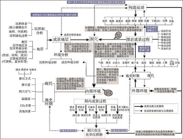 区域地层既为区域构造、自然地理环境、洞穴环境及洞穴次生化学沉积物提供共同的物质基础——可溶性地层,也为它们提供共同的作用对象——洞穴,更是次生化学沉积物成景过程的储水库。不同区域对应可溶岩的分布、岩性、可溶性等特征也不同,决定着洞穴次生化学沉积成景过程的差异;而洞穴次生化学沉积物则是不同区域地层系统及不同地质时期地层系统演变的感应器和记录者。