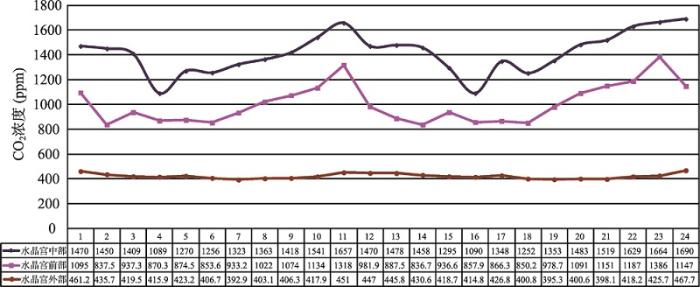 (3)岩溶水CO2来源和转换 雨水在下降过程中不断吸收大气中的CO2,使CO2含量稍高于初始时期;当地表流水渗入土壤中,暂时贮存于其中,与土壤进行全方位接触时,土壤空气中部分CO2溶于水转化成岩溶水中的CO2(CO2+H2O ⇋ H2CO3),CO2含量大幅升高,一般比大气CO2含量大十几倍以上,最高可达几百倍;在沿地表、浅层、中部、深部循环带继续潜蚀、下渗(CaCO3+H2O+CO2 ⇋ Ca2++CO32-+H++HCO3-⇋Ca2++2HCO3-)补给管道式岩溶水的过程中,CO2含量仍不断得到增加,远远大于降水过程中吸收的CO2含量。上述过程意味着土壤层是岩溶水中CO2的最主要来源,主要通过裂隙式岩溶水进行转化和交换。因此对应不同的土壤类型、植被类型、植被覆盖率、气候类型和发育深度等,水晶宫不同区域具有不同的CO2含量(表3)。
