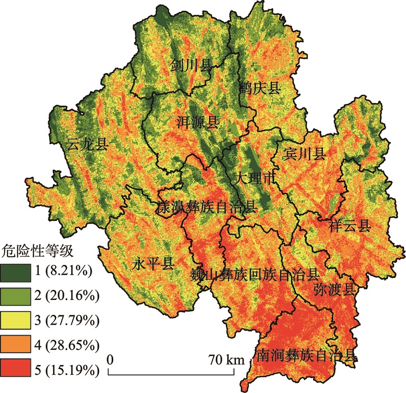 云龙县整体地势较高,平均海拔2163 m,69.5%以上区域海拔高于2200 m,属于相对不易发育滑坡的高程范围;岩组构成方面,第四类极易诱发滑坡灾害的岩性区域仅分布有11.93%的面积;全县偏旱少雨,多年平均降雨量仅为985 mm,一定程度上减少了滑坡发生的冲刷侵蚀动力;且植被覆盖密度较高,全县平均NDVI为0.70,为水土保持和坡面稳定性保护起到正向促进作用。综上所述,云龙县整体而言地质灾害危险性相对较低,县内第5等级危险区仅占3.91%,第1、2、3、4级危险区面积比例分别为12.25%、30.47%、31.43%、21.95%,呈现出较为均衡的分布态势。