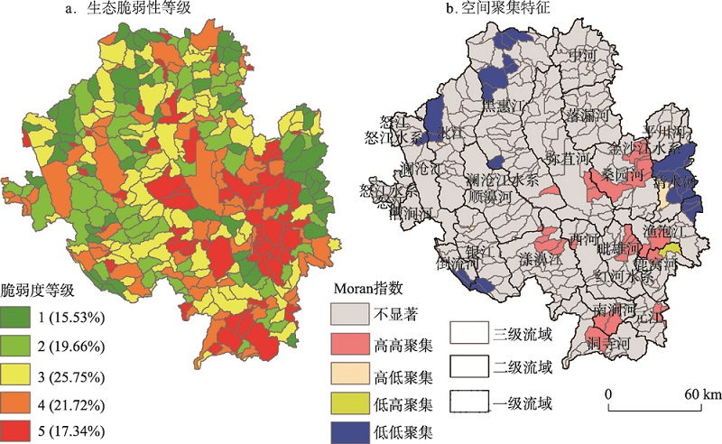 Fig. 4 Ecological vulnerability and its spatial agglomeration in Dali Prefecture at watershed level
