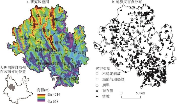 中国西南山地的地质构造活动强烈、地形地貌复杂、气候条件多变,是滑坡等地质灾害的密集高发区域。同时,为缓解快速城市化中的人地矛盾困境,中国山地城镇建设开发活动日益频繁[23-24],更易导致山地地质环境容量超载,加剧地质灾害的发生。云南省大理白族自治州(简称大理州)作为地质灾害频发的典型西南山区,其本身还是生物多样性热点区、生态环境敏感区[25-26]、低丘缓坡建设开发试点区[27]。因此,对大理州地质灾害生态风险的定量评估,对于区域可持续发展尤为重要。基于此,本文以大理州为例,关注风险源、风险受体、暴露响应过程及生态终点,基于“危险性—脆弱性—潜在损失”的生态风险评价三维框架综合度量流域尺度滑坡灾害生态风险,试图通过强调暴露响应过程将区域生态系统结构与功能、格局与过程的关联信息融入到风险评价流程中,从而增强对区域生态风险机理的认知。