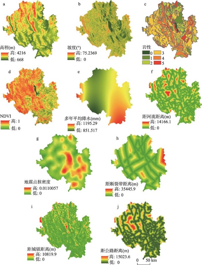 基于大理州滑坡形成规律及其空间分布特征,从地理环境因素、地质构造因素、人类活动因素三个维度,分别选取高程(a)、坡度(b)、岩性(c)、归一化植被指数(d)、多年平均降水量(e)、距离河流距离(f)、地震密度(g)、断裂带距离(h)、距城镇距离(i)、距道路距离(j)等10个具体的滑坡灾害危险性评价指标(图2)。
