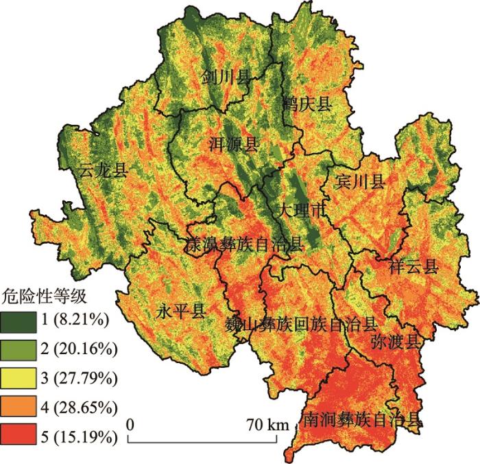 将10个分图层的信息量做极差标准化后加权叠加,得到研究区滑坡灾害的综合信息量,继而将综合信息量归一化,并利用自然断点法分级,得到栅格尺度的危险性指数图层,级别越高危险性越大(图3)。由图3可看出,大理州滑坡灾害危险性普遍处于中高水平,以4级最多,占全州土地总面积的28.65%,1级危险性仅占8.21%;从空间格局看,危险性整体呈现出西北低东南高的分布特征。全州滑坡灾害4、5级较高危险性区域在东南部的巍山、南涧、祥云等县分布最为广泛;同时,1、2级较低危险性区域则集中在西北端的云龙、洱源和剑川,此3个县较低危险区占该类型总面积的比例高达54.61%。