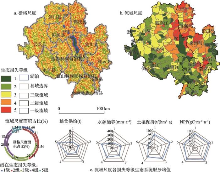 就流域尺度而言,潜在生态损失较低等级(1~2级)的流域主要分布在大理州西南部,如永平县境内的银江流域、巍山境内的西河流域等(图5b)。这些流域受地形限制,耕地分布零散,阔叶林相对较多,水源涵养服务和粮食供给服务相对较差。潜在生态损失为第3等级的流域面集中在大理州西北部,如云龙境内的澜沧江流域、漾濞境内的顺濞河流域等。这些流域地形较为起伏,流域所涉及的澜沧江与怒江的高、中山河谷区土壤保持量明显高于东部苍山洱海高原湖盆区;同时,15°~25°坡度带面积比重较大,坡度与水热条件适宜多种植被生长,有利于净初级生产和土壤保持服务优势的发挥。潜在生态损失较高等级(4~5级)的流域集中分布于大理州东北部,如宾川县桑园河流域、鹤庆县中河及落漏河流域等。这些流域地势相对平坦,耕地面积广阔、分布密集,水热条件良好,是大理州主要的粮食供给区,且混交林较多,森林水源涵养效率高、涵养水源量大,故具有较强的粮食供给服务和水源涵养服务(图5c)。