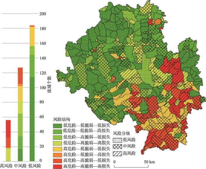 对比各等级风险的结构组成及相应流域数量(图6)可知,高风险区域包括5种风险组成,以三高型“高危险—高脆弱—高损失”和两高型“低危险—高脆弱—高损失”、“高危险—高脆弱—低损失”为主。低风险区域包括7种风险组成,以三低型“低危险—低脆弱—低损失”和两低型“低危险—低脆弱—高损失”、“高危险—低脆弱—低损失”、“低危险—高脆弱—低损失”为主。中风险区域则包括除“高危险—高脆弱—高损失”之外的全部7种类型,且各类型的数量分布相对较均衡。