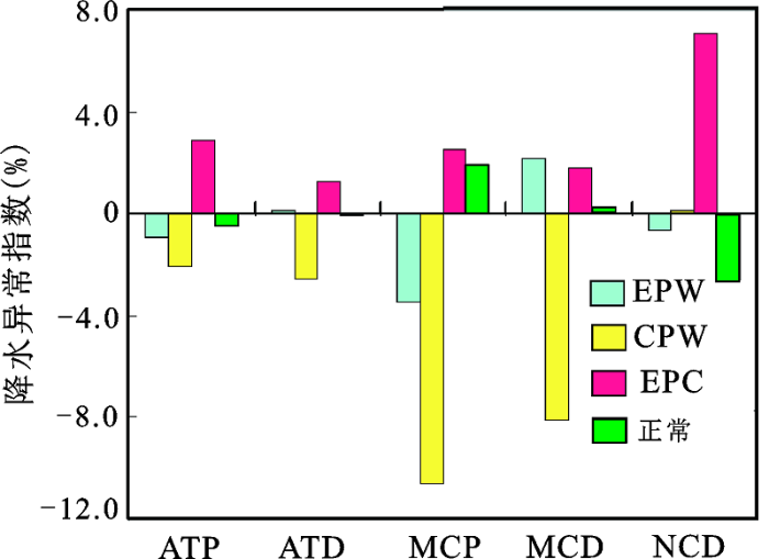 图2表示不同ENSO年和正常年份各降水过程指标的距平变化。从图2中可看出,在CPW年,淮河流域连续降水时间(MCD)、连续降水量(MCP)的距平变化幅度较大且为负值,但降水日数减小幅度较降水总量减小的幅度小;而在EPC年,淮河流域最长连续无降水日数(NCD)变长,其异常指数最大为7.09 %。EPW年连续降水日数变长而连续降水量却减少。