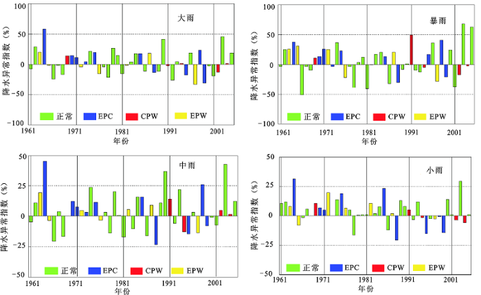 在CPW、EPW年淮河水系暴雨、大雨日数较正常年份多;在沂沭泗河水系北部区域暴雨、大雨日数较正常年份少(图4)。与此相反,EPC年流域东北部地区的暴雨日数较正常年份增多,南部则较正常年份少。CPW、EPW年对小雨、中雨影响较小,流域大部分区域小雨、中雨异常指数都集中在±10%,与正常年份差距不大。综上所述,CPW、EPW年对流域的淮河水系大雨、暴雨的影响较大,在CPW、EPW年淮河往往有洪水发生,如1963、1991年等;而在EPC年淮河流域的东北部多有洪灾发生,如1964、1975年等。