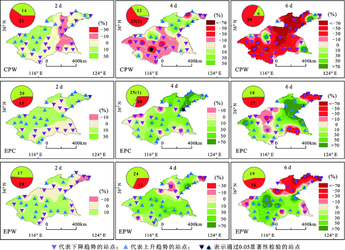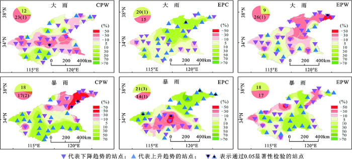 图4 在不同的ENSO事件中降水强度异常指数空间分布(图中圆图的红色部分为下降趋势的站点数,绿色部分为上升趋势的站点数,括号中数字为通过0.05显著性检验站点数,后图同此)