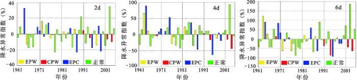 4) ENSO对淮河流域连续4 d以上降水影响较大,尤其对连续5 d以上降水影响更加显著。EPC年对淮河流域降水历时影响较大,各降水历时异常指数均比CPW和EPW年高,除连续1、2 d降水异常指数在±40%以下外,其余均在±40%以上,尤其是连续6 d降水,10 a中有5 a超过±50%,在EPC年淮河流域多出现不同程度洪水灾害。CPW年对连续6 d降水影响最大,异常指数超过±50%,且对流域多日降水影响范围最广;而EPC年和EPW年都有明显的正负距平集中区域,分别集中在淮河水系和沂沭泗河水系。