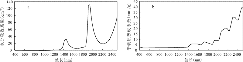 PROSPECT模型是一个基于平板模型来计算叶片半球反射率和透射率的辐射传输模型(模拟的光谱范围为400~2 500 nm)[17,18]。该模型根据组分浓度(叶绿素浓度、水的浓度和干物质浓度等)及对应的吸收系数来描述植被叶片对光的吸收特性。模型中水、叶绿素和干物质的吸收系数是通过实验来确定的。本研究从PROSPECT模型中获取公式(1)中的水分吸收系数[Kw(λ)]和干物质吸收系数[Kp(λ)]2个参数(图2)。图中看出,水分在近红外和短波红外光谱范围存在吸收光谱,而在可见光区域其吸收光谱近乎为0。干物质的吸收光谱主要位于短波光谱范围。