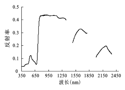 众多实验研究表明,水分对植被光谱反射率的影响波段范围在近红外波段(NIR)和短波红外波段(SWIR)。由于植被叶片的细胞液、细胞膜及吸收水分,在1 450和1 950 nm附近有吸收波谷,在970和1 190 nm波段附近也有强吸收特征。由于植被叶片水分的光谱吸收,随着叶片含水量的增加,光谱反射率减小,反射光谱曲线的波谷和波峰的相对形态变得更为突出明显[4]。